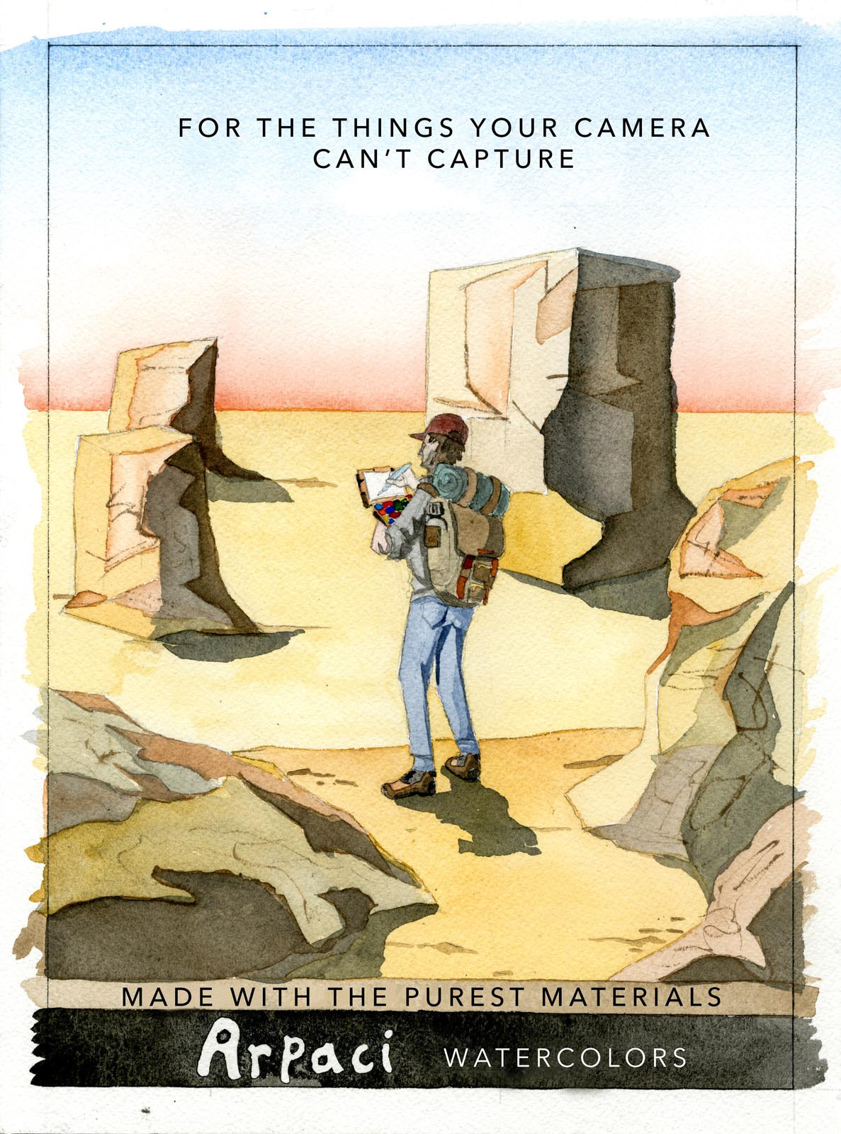 Poster for a project branding a fictional watercolor company, Arpaci, made to emulate and appeal to plein air painting.
