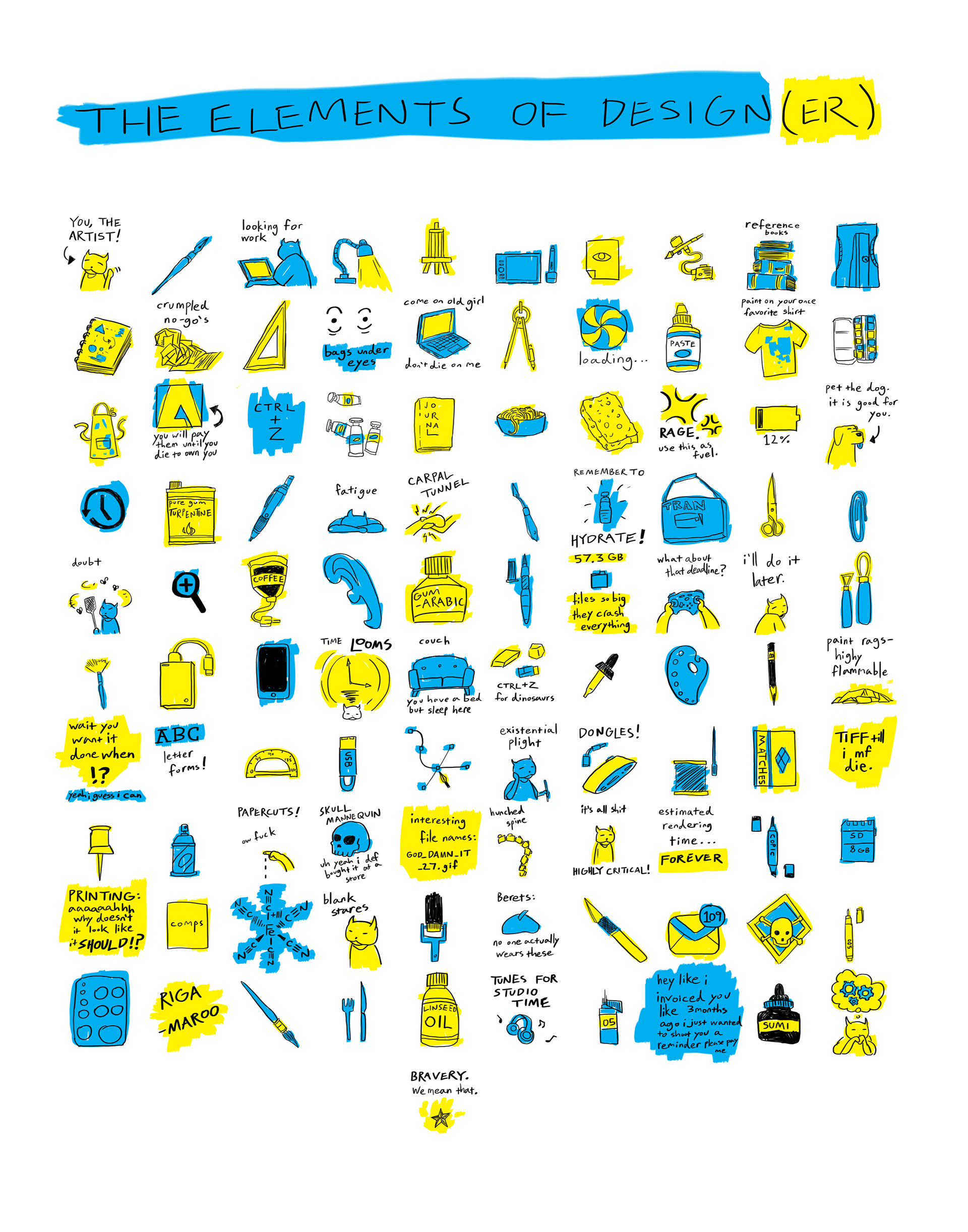A diagrammatical "map" designed to highlight some of the tropes associated with designers. Exhibited at the 2019 CSUN Annual Student Illustration Show.